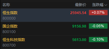 香港三大股指当天涨跌不一。恒生指数上涨0.07%至25945.54点,恒生科技指数下跌0.10%,国企指数下跌0.06%。科技及互联网股盘中涨跌不一,百度跌逾1%,联想涨逾0.5%。黄金股全线上涨,紫金矿业涨幅超2%。创新药概念涨逾4%,博安生物涨逾4%。国内地产股多数低开,万科跌幅超5%。